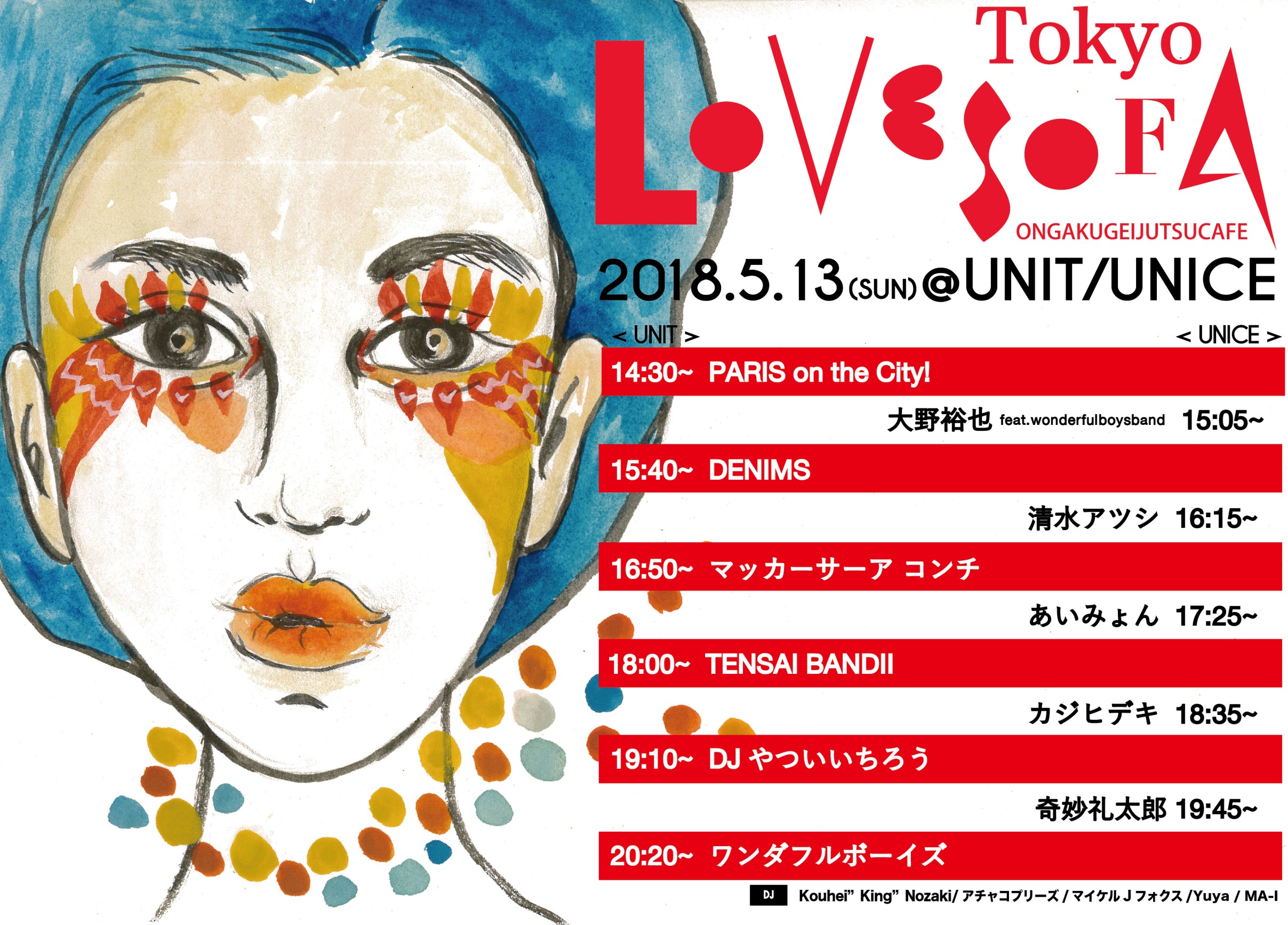 いよいよ2018年5月13日(日)に東京・代官山UNIT & UNICEでの開催が迫ってきたTENSAI BANDⅡ・ワンダフルボーイズのSundayカミデ主催ライブイベント“Love sofa Tokyo”のタイムテーブルが発表です。
